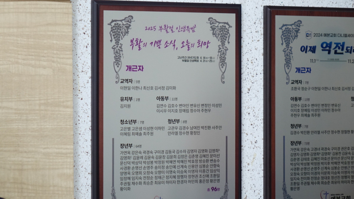 2025 부활절 인생특밤 개근자 현판 제막식 페이지 정보 작성자 관리자 댓글 0건 조회 520회 작성일 25-05-18 23:52 본문 2025 부활절 인생특밤 개근자 현판 제막식 2025년 5월 18일 주일 목록 이전글유치부 개근 어린이 시상 25.05.19 다음글교육대회 시상식 & 스승의주일 25.05.18 댓글목록 댓글목록 등록된 댓글이 없습니다.