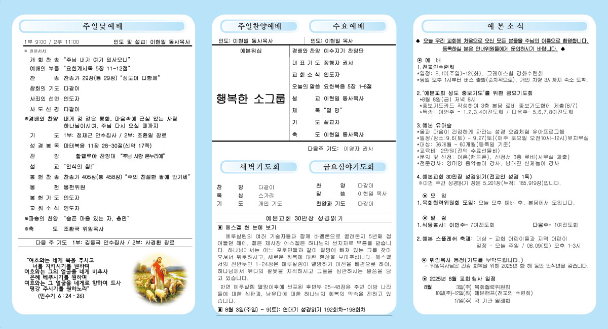 8월 3일 주보 페이지 정보 작성자 관리자 댓글 0건 조회 292회 작성일 25-08-09 23:35 본문 8월 3일 주보 목록 이전글8월 10일 주보 25.08.09 다음글7월 27일 주보 25.07.26 댓글목록 댓글목록 등록된 댓글이 없습니다.