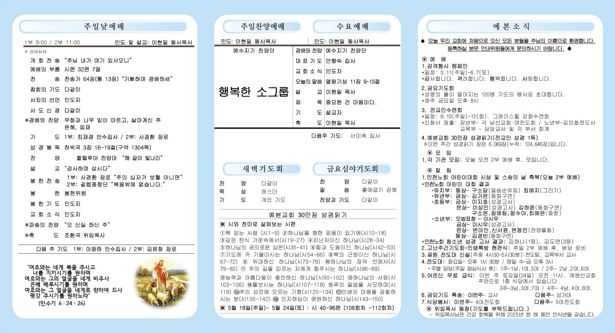 5월 18일 주보 페이지 정보 작성자 관리자 댓글 0건 조회 332회 작성일 25-05-17 22:10 본문 5월 18일 주보 목록 이전글5월 25일 주보 25.05.24 다음글5월 11일 주보 25.05.10 댓글목록 댓글목록 등록된 댓글이 없습니다.
