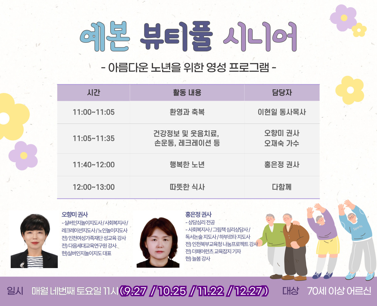 예본 뷰티풀 시니어 페이지 정보 작성자 관리자 댓글 0건 조회 750회 작성일 25-09-12 14:12 본문 2025년 9월부터 12월까지 매월 4번째 토요일 오전 11시 목록 이전글2025 추석 가정예배 순서지 25.09.27 다음글2025 Yebon Splash 25.08.01